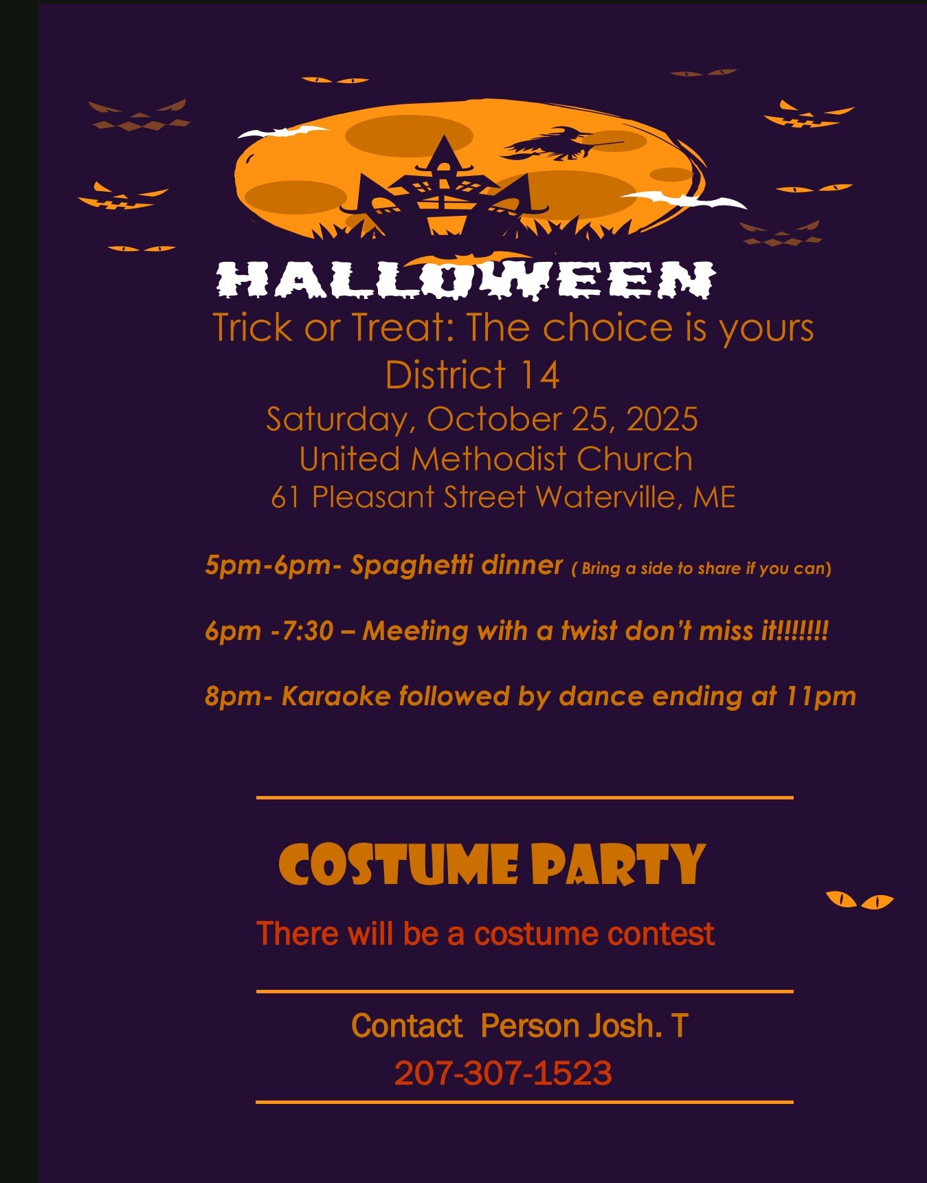 District Meeting @5PM Pleasant St. United Methodist Church 61 Pleasant St. Waterville, ME 04901 - Zoom Meeting ID 818 2737 2925 ---Zoom Password: 414261